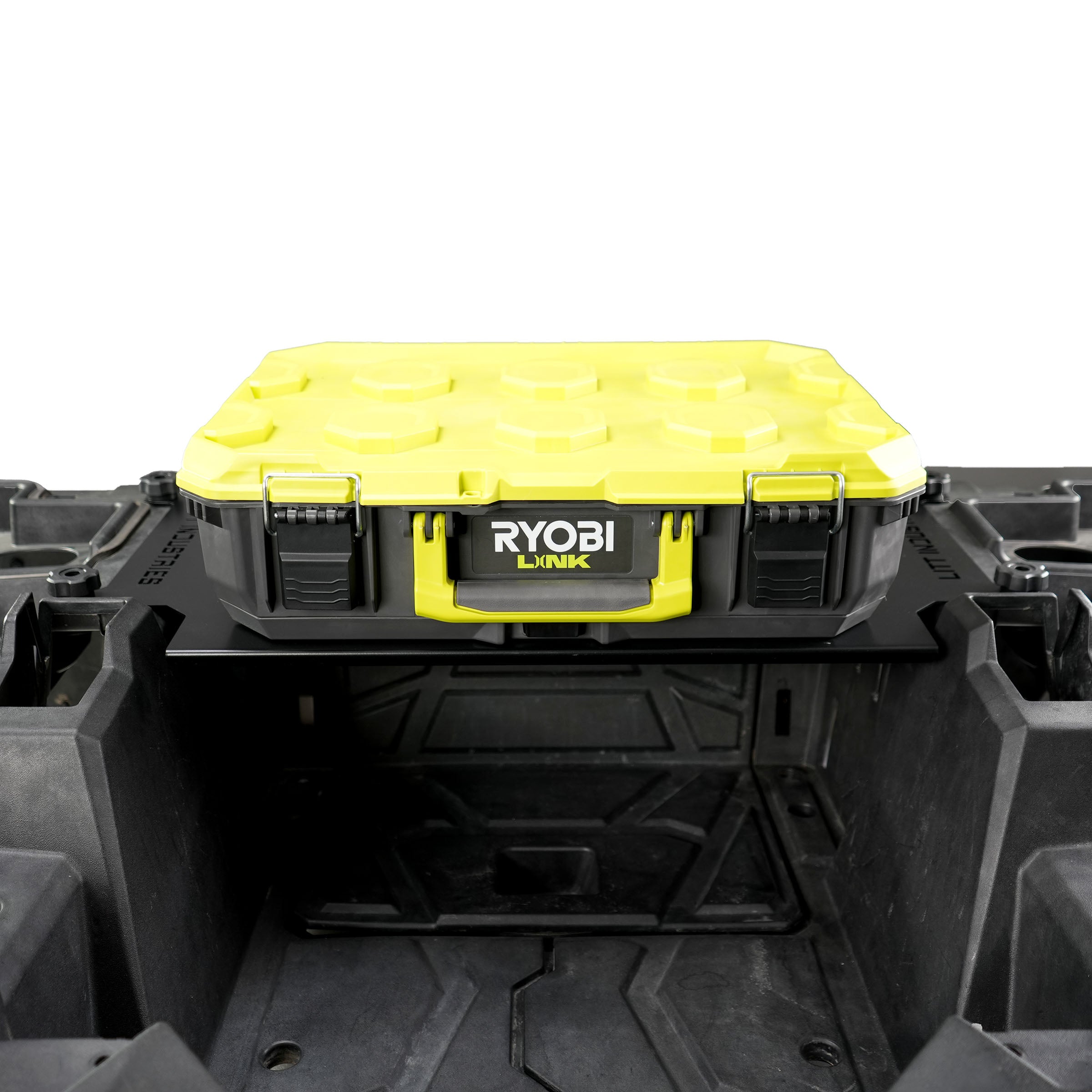 Securely mounts most Ryobi Packout boxes to the RZR bed with room underneath for a spare belt, other tools, etc...